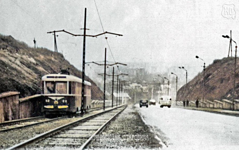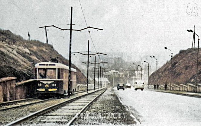 На фото добре видно трамвайні колії, якими рухається трамвай, — важливий транспорт того часу. Поруч із коліями пролягає автомобільна дорога, якою їдуть легкові машини та впадає в око старий автобус характерної для тієї епохи форми. Міський пейзаж поєднує будівлі, транспорт і відкритий простір вулиці, передаючи атмосферу Кривого Рогу другої половини ХХ століття, коли трамвай і автобус були основними засобами пересування містян.