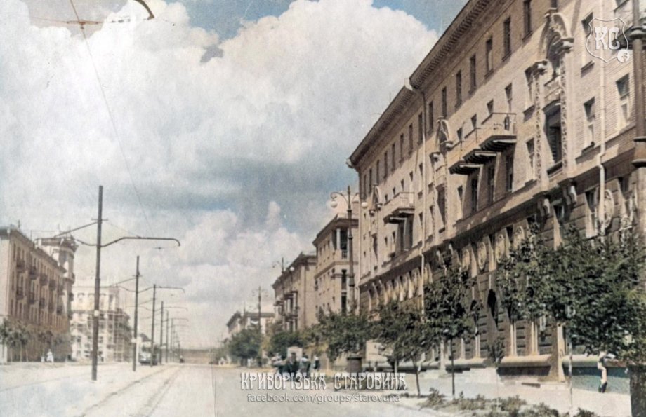 Широкий проспект з трамвайними коліями посередині та новими чотири- і п’ятиповерховими будинками у стилі сталінського ампіру. Фасади прикрашені ліпниною, арками та декоративними балконами. Уздовж тротуарів висаджені молоді дерева, а на вулиці ще небагато транспорту й пішоходів — місто тільки набирає свого післявоєнного ритму.