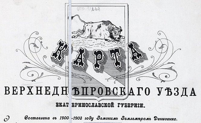 Світлина зі стилізованим словом «КАРТА», над яким розташований загадковий малюнок бика. Карта була складена земським землеміром Денисенком. Так виглядали офіційні мапи на початку ХХ століття, показуючи адміністративний поділ земель, що тепер входять до складу сучасної Дніпропетровщини.