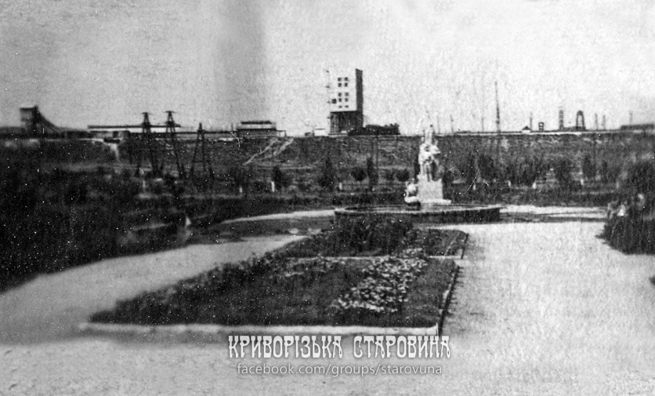 На фотографії початку 1960-х років зображено сквер на Первомайці (Тернівський район) з фонтаном та скульптурною композицією, де мешканці могли відпочивати. На задньому плані видно індустріальний пейзаж: копер шахти «Північна-Вентиляційна» рудника ім. К. Лібкнехта та залізничний насип колишньої Катерининської залізниці.