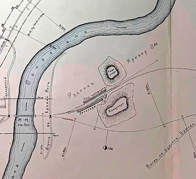 На плані 1907 року зображено перший залізорудний рудник Криворіжжя — «Саксаганський», відкритий у серпні 1881 року. Видно сам рудник, річку Саксагань і околиці, що раніше були степами. Рудник належав анонімному акціонерному товариству «Криворізьких залізних руд», заснованому в Парижі в грудні 1880 року за ініціативою Олександра Поля.
