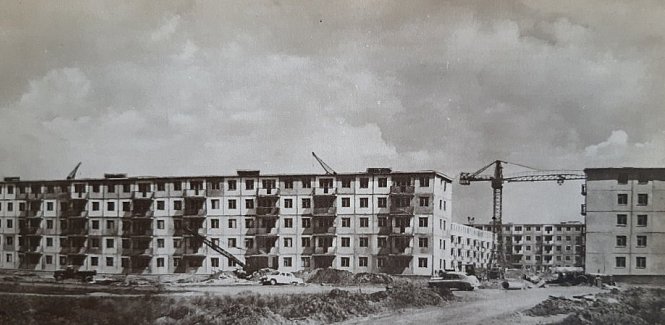 На фотографії початку 1960-х років показано житлове будівництво на вулиці XXII партз’їзду (нині Віталія Матусевича) у Кривому Розі. У кадрі видно масив типових багатоповерхівок, зокрема будинок №55, а також крани й робітників.
