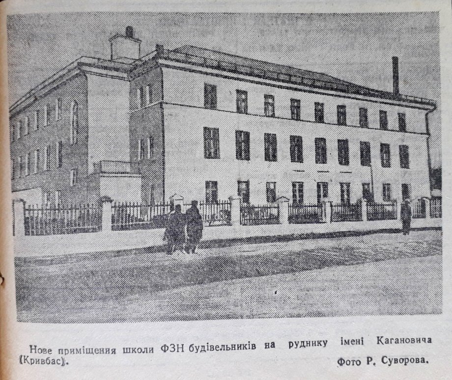 Знімок показує нову будівлю школи ФЗН будівельників на руднику імені Кагановича («Кривбас»). Фото, зроблене Р. Суворовим для газети «Зоря». Видно будівлю школи, яка слугувала центром підготовки робітників для промислових підприємств міста.