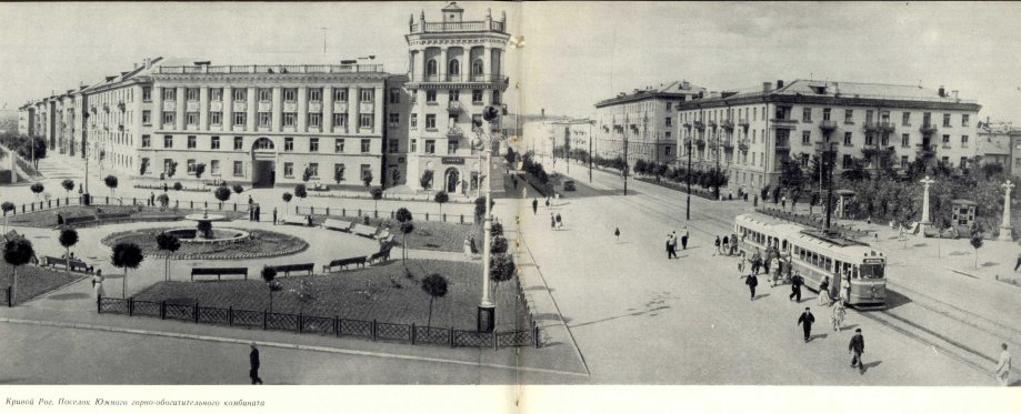Знімок з книги «Чорна металургія СРСР. 1917–1967» (М., 1967) показує Південний гірничо-збагачувальний комбінат (Південний ГЗК) у Кривому Розі. На передньому плані видно велику будівлю з колонами — ймовірно Палац культури або іншу громадську споруду, поруч — сквер із лавками та фонтаном. По вулиці рухається тролейбус, а пішоходи прогулюються тротуарами.
