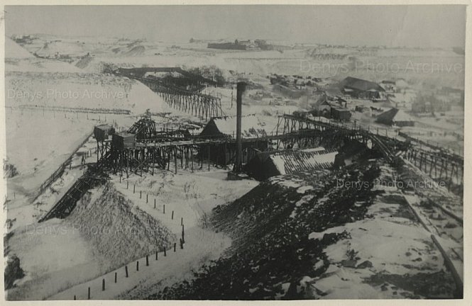 Перед нами зимовий пейзаж рудника, накритого снігом. На передньому плані видно дерев’яні конструкції — підйомні механізми, естакади та жолоби для транспортування руди. У центрі кадру височіє димова труба, а будівлі рудника розташовані на різних рівнях схилів, за ними — відвали пустої породи. Знімок Едуарда Фукса початку ХХ століття, відбиток якого зберігся з 1970-х років.