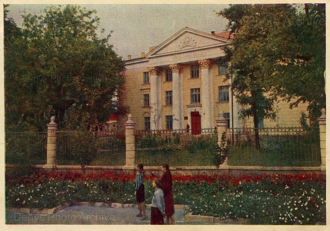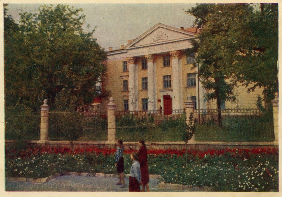 Кольорова поштівка 1960 року, зроблена Т. Бакманом, показує будівлю музичної школи в Кривому Розі. Перед школою видно квітник із червоними та білими квітами і ковану огорожу з кам’яними стовпами.
