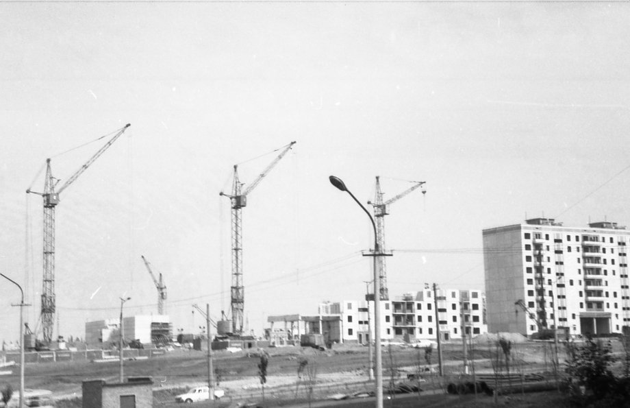 З родинного архіву датоване фото показує будівництво житлових будинків у Кривому Розі, район 5-го мікрорайону Зарічний. На знімку видно кілька баштових кранів, багатоповерхові коробки на різних стадіях спорудження та майже завершену дев’ятиповерхівку з балконами й великою вхідною аркою. Попереду простягаються порожні ділянки, прокладені дороги, автомобілі та будівельна техніка.