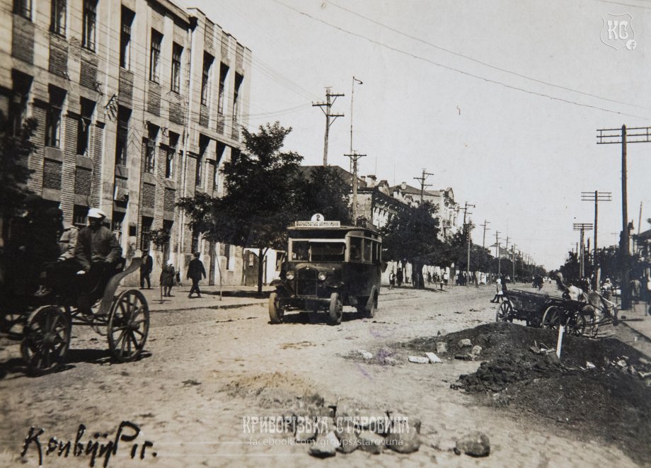 На знімку показано проспект у період початку індустріалізації Кривого Рогу. У центрі рухається автобус маршруту №2 «Карнаватка – Кривий Ріг», один із перших регулярних рейсів, що з’єднував робітничі райони з центром. Ліворуч видно будівлю редакції газети «Червоний гірник», головного видання міста. Вулиця ще не вкрита асфальтом — помітна нерівна бруківка та ремонтні роботи; праворуч рухаються кінні вози, що співіснували з першим автотранспортом.