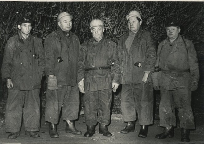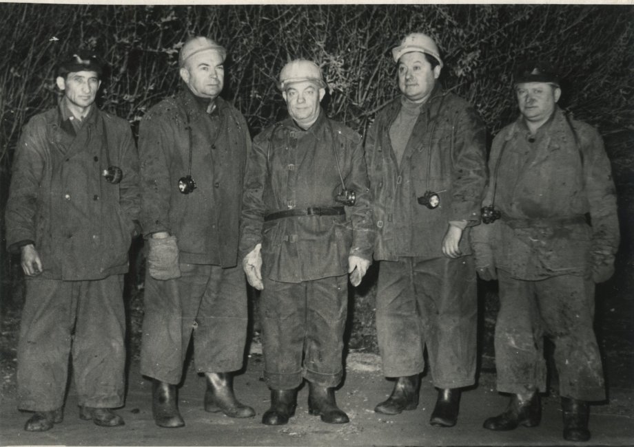 На знімку зображено трьох працівників Шмаківського рудника — крайній праворуч - Анатолій Вікторович Орлов, заступник головного інженера шахти. Поруч з ним - начальник шахти Грідасов.