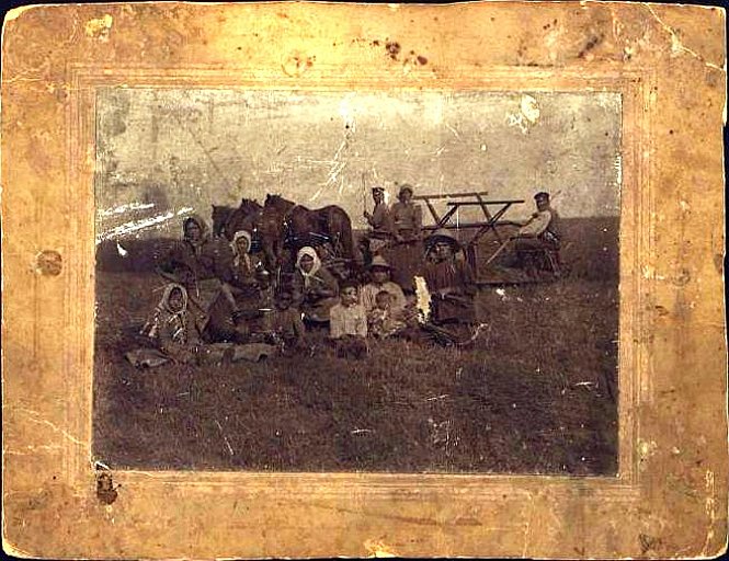 Ця світлина початку ХХ століття української селянської родини Несмашних із Веселих Тернів. На знімку — чоловіки, жінки та діти, що відпочивають посеред поля під час жнив. Поруч стоїть жатка, запряжена кіньми.