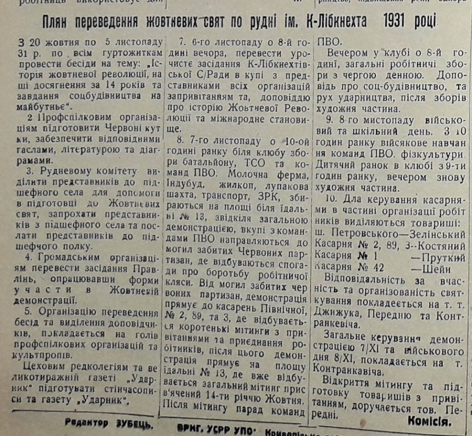 План свят на руднику ім. К.Лібкнехта, 1931 рік