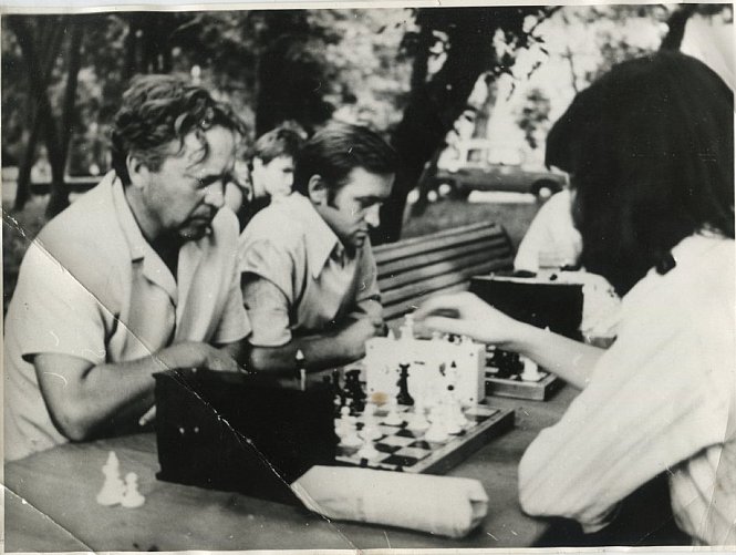 На фото — учасники фіналу міської першості з шахів між командами Гіпрорудмаш і ВНІІБТГ, що завершилася з рахунком 2:0. На першій дошці — Жажко Георгій Олександрович, на другій — Орлов Сергій Анатолійович. Змагання відбувалося в парку імені газети «Правда» у Кривому Розі.