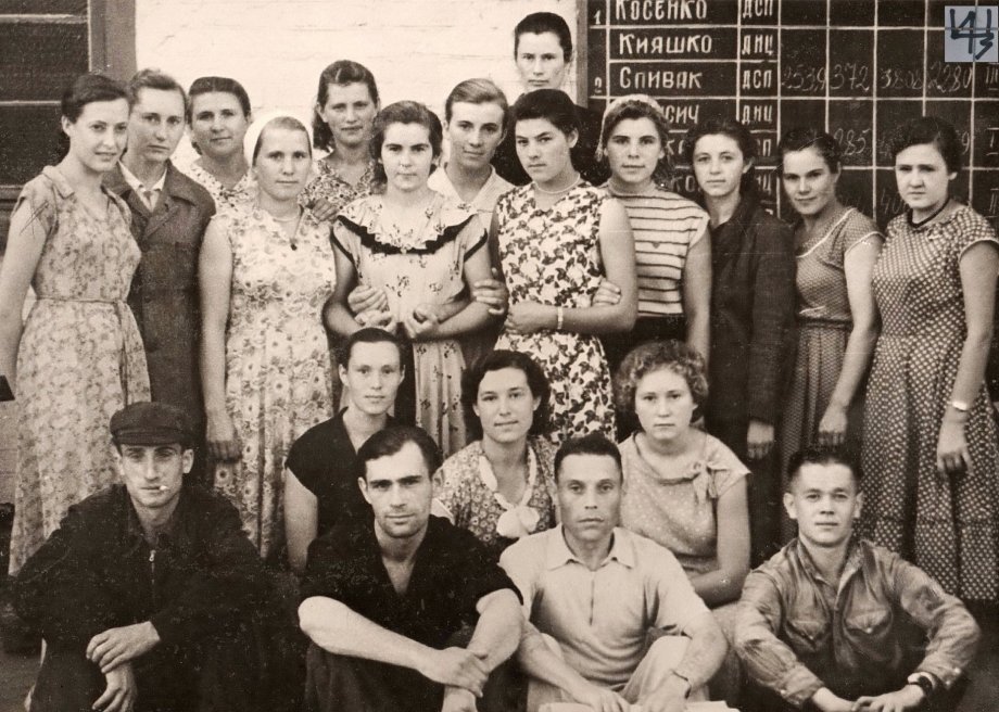 Робітники після зміни позують на пам’ятному фото — молоді, спрацьовані обличчя, типова робітнича форма того часу.