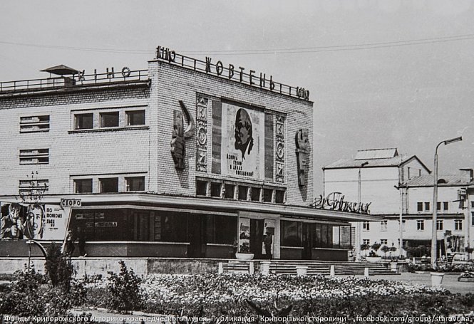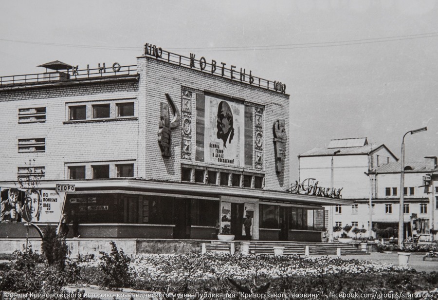 Вид на вулицю Мусоргського з кінотеатром «Жовтень», який був одним із популярних культурних осередків Кривого Рогу у 1960-х роках. На фасаді видно афішу фільму «По тонкому льоду». Фото із фондів Криворізького історико-краєзнавчого музею.