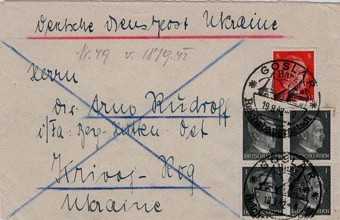 Додаткова інформація: Поперечний синій хрест на конверті зазвичай означає, що пошта була повернена, не доставлена або скасована з якихось причин. Штамп містить дату 19.09.42, що підтверджує дату відправлення. Адреса "Krivoj-Rog" (Кривий Ріг) була місцем призначення в окупованій на той час Україні. Конверт стосується періоду Другої світової війни, коли на території України діяла спеціальна німецька військова та службова пошта (Deutsche Dienstpost Ukraine).