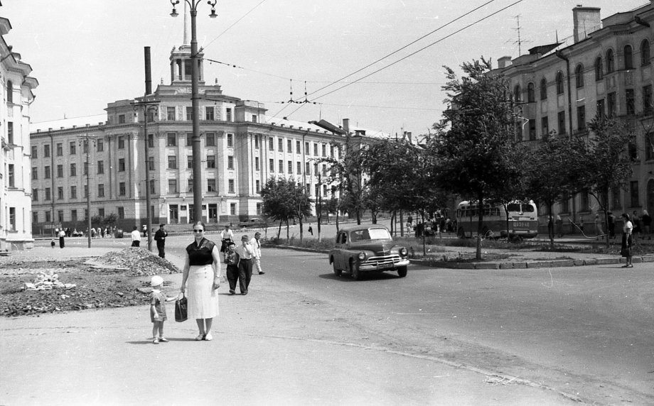 Центральна адміністративна будівля тресту «Ленінруда» (згодом — Кривбасруда, нині — КЗРК). Перед спорудою — вулиця з автомобілем ГАЗ-М20 «Побєда», пасажирський автобус і пішоходи. Архітектура будівлі — сталінський ампір із колонадою та куполом.