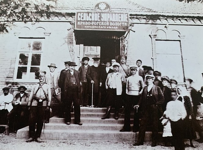 Групове фото перед будівлею Криворізького волосного сільського управління, Херсонський повіт, 1910-х років