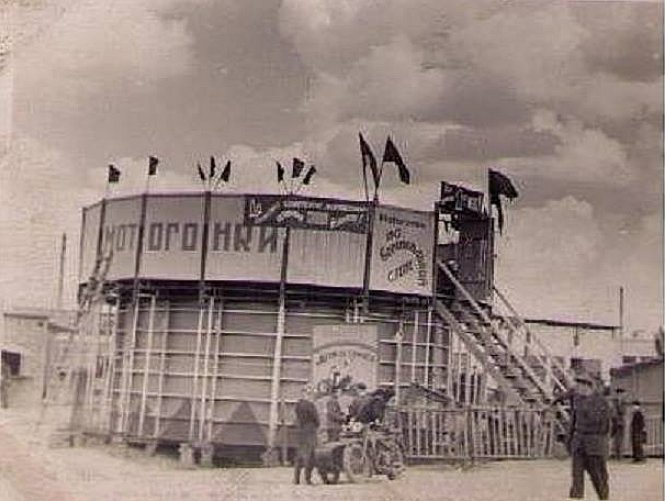 Конструкція дерев'яна, круглої форми, з рекламними написами та прапорцями по периметру. До входу ведуть сходи, зібрався натовп глядачів, видно мотоцикл. Атракціон розміщувався поблизу ринків на Соцмісті й у Центрально-Міському районі.