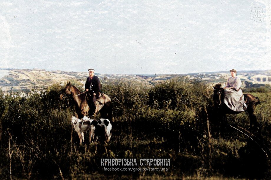 На передньому плані — чоловік і жінка верхи, поряд з чоловіком — пара гончих. Місцевість — степова, поросла чагарником, на горизонті видно кар'єрні вирізи. Фото зроблене в районі сучасного мікрорайону Червоний Гірник, поблизу річки Саксагань.