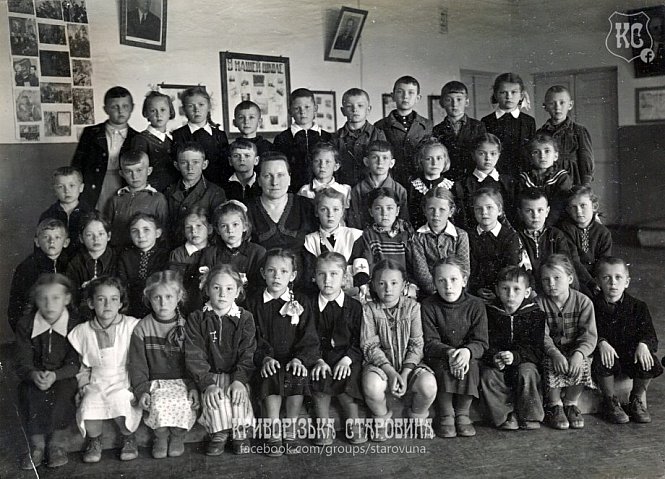 Колективне фото учнів початкових класів однієї зі шкіл рудника імені Кагановича (після 1956 року — рудник ім. ХХ Партз'їзду). П'ять рядів дітей разом з учителькою, усі в шкільному одязі — сукні, сорочки, піонерські галстуки. На стінах класу — плакати, стенди, портрети.
