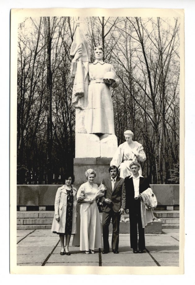Центральна фігура монумента — радянський воїн із прапором і каскою, нижче — алегорична жіноча постать. Перед постаментом стоїть п’ятеро людей, ймовірно, родичі або друзі, святково вбрані, з квітами. Дерева без листя — фото зроблено навесні або восени.