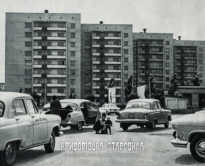 На передньому плані — група легкових автомобілів, зокрема «Волги» й «Москвичі», біля яких пасажири готуються до поїздки або щойно прибули. Декілька людей на пероні, діти граються. На задньому плані — новозбудовані дев’ятиповерхівки. Світлина з фотоальбому «Кривий Ріг», видавництво «Мистецтво», Київ, 1971.