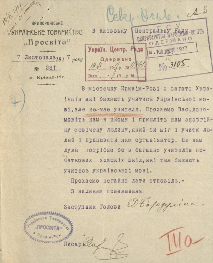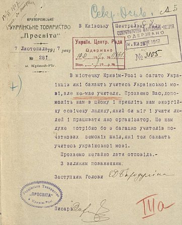 В містечку Кривім-Розі є багато Українців які бажають учитись Української мові, але не має учителя. Прохаємо Вас, допоможіть нам в цйому і пришліть нам енергійну освічену людину, який би міг і учити людей і працювати яко організатор. Це нам дуже потрібно бо є багацько учителів початкових земськіх шкіл, які теж бажають учитесь української мові. 7 листопада 1917 рік.