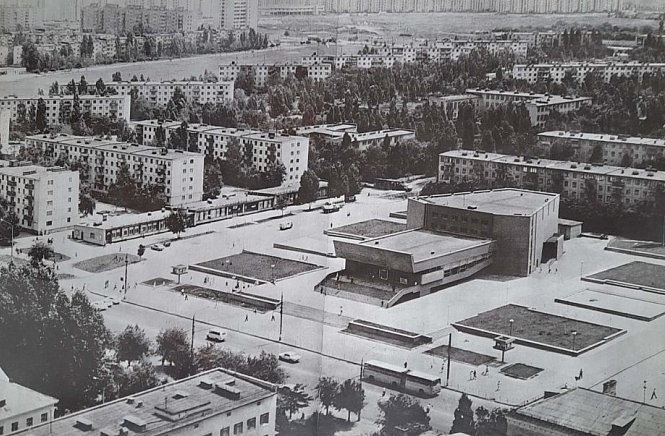 Панорама житлового району. На передньому плані — сучасна на той час будівля з великою терасою (ймовірно, Палац культури, кінотеатр або великий торговий об’єкт). Територія навколо — впорядкована площа з газонами та тротуарами. Видно п’ятиповерхову забудову та більш висотні будинки на задньому плані. Біля дороги — автобуси, легкові автомобілі, пішоходи.