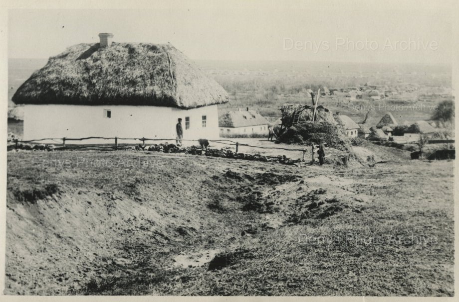 На передньому плані — традиційна українська хата з біленими стінами та солом’яною стріхою, обнесена тином. Біля хати стоїть чоловік. На задньому плані видно господарські споруди, стіжки сіна, село з глиняними хатами і дерев’яними дахами. Фото зняв Едуард Фукс, відбиток зроблений у 1970-х роках з оригінального негативу.