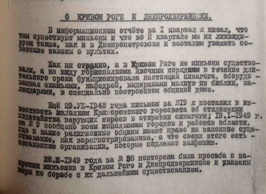 І з нього ми дізнаємося, що до цього часу у Кривому Розі та по Дніпропетровській області за ІІ квартал 1949 року діяла повноцінна синагога, збудована юдейською громадою, очевидно, у 1944 р. або трохи пізніше ("приличный дом размером 6,8х10... в одном примерно километре от самого исполкома"). Закрита вона була за розпорядженням влади 29.05.1949 р. ЦДАВО, ф. 4648., оп. 4, спр. 55.