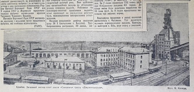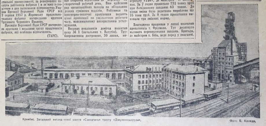 На знімку з газети «Зоря» показано загальний вигляд нової шахти «Саксагань»: виробничі корпуси, адміністративний будинок та копрова вежа формують масштабний промисловий комплекс. Перед спорудами проходять залізничні колії, що забезпечували транспортування руди.