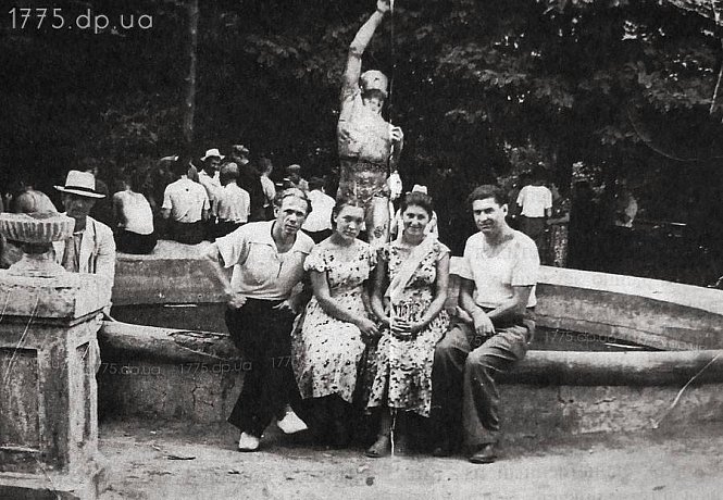 Парк у 1949 році. «У парку праворуч був дерев'яний літній клуб, там же бассейн зі спортсменом. На початку головної алеї стояли скульптури: ліворуч Леніну, праворуч Сталіну. Ще трохи праворуч, на клумбі, жінка з дитиною в руках. Далій- літня хата-читальня. Ближче до центру та праворуч - танцювальний майданчик. Наприкінці алеї стояла скульптура Орджонікідзе. Пізніше його переставлять у скверік 17 квартала. Скульптуру Леніна перенесуть на ш. им Леніна, а Сталіна скинуть у кар'єр». З книги «Криворізька зірка Колачевських"автори О.Мельник і І.Стеблина».