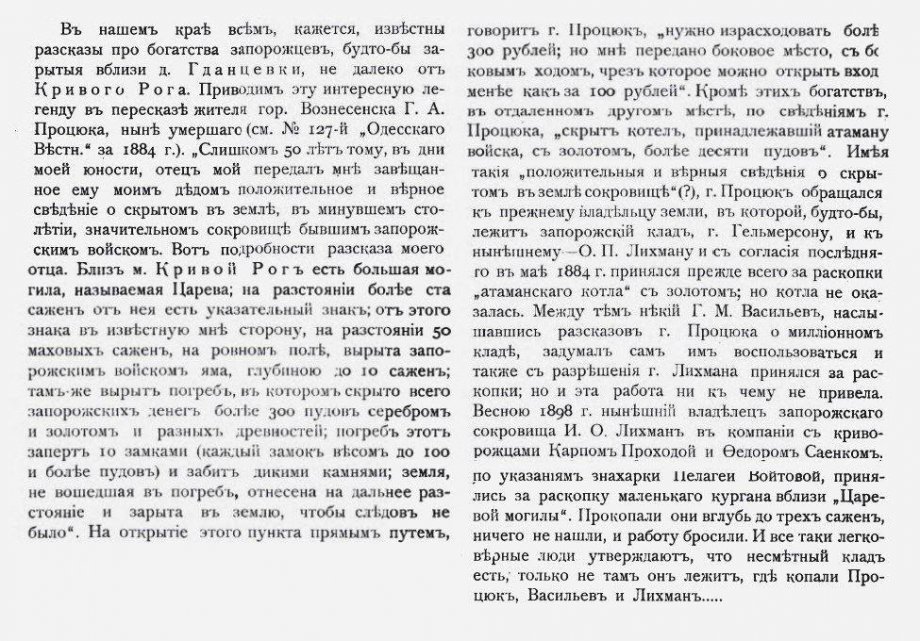В книзі «Клады и древности Херсонской губерніи» за 1902 рік є згадка про клад Запорізького війська схований на криворізькій землі, поблизу кургану Царева могила. Був клад чи ні можна тільки здогадуватись, адже вже багато років на місці кургану кар’єр №3 АрселорМіттал Кривий Ріг.
