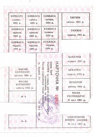Картки (талони) на дефіцитні товари — ковбасу, вершкове масло, тютюн, цукерки, мийні засоби та інші продукти. Документ із відмітками про видачу товарів у торговельних точках міста.