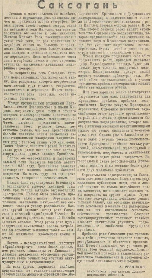 Стаття «Саксагань», присвячена проблемам регулювання русла річки Саксагань, водопостачання Криворіжжя та проєктам будівництва водосховищ для потреб промисловості й сільського господарства.
