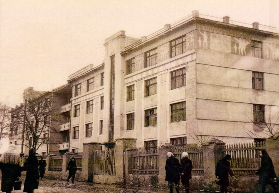 Архівний знімок середини ХХ століття, на якому зафіксовано головний фасад навчального закладу та частину вулиці перед ним.