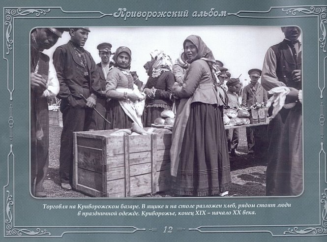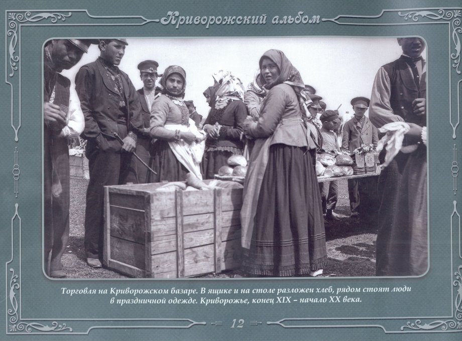 «Торгівля на криворізькому ринку. У ящику та на столі розкладено хліб, поряд стоять люди у святковому одязі. Криворіжжя, кінець XIX - початок XX століття». Світлина з видання «Криворізький альбом». За фотографіями Едуарда Фукса на початку ХХ століття, автор Ігор Рукавіцин.