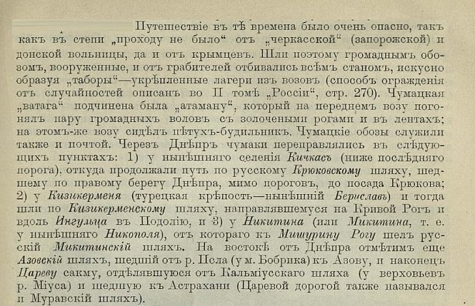 Текст на фото описує небезпеки подорожей чумаків через степ, де вони змушені були об'єднуватися у великі озброєні обози («табори») для захисту від нападів. Один із головних маршрутів — Кизикерменський шлях — проходив саме через Кривий Ріг, куди чумаки прямували після переправи через Дніпро біля нинішнього Берислава. Крім нього, у тексті згадуються ще Крюківський та Микитинський шляхи