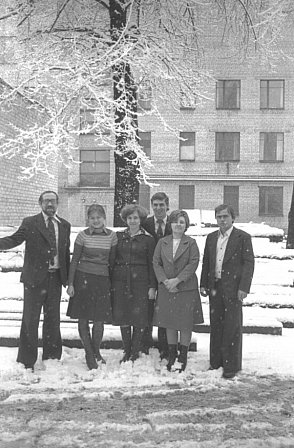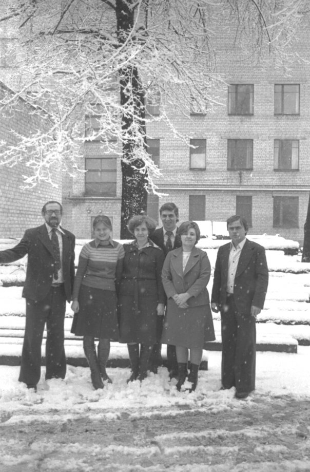 Група працівників інституту на фоні засніженого парку Правди (Після декомунізаціїї - Мершавцева). На задньому плані видно цегляний корпус закладу та вкриті памороззю дерева.