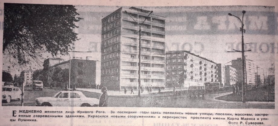 «Щоденно змінюється обличчя Кривого Рогу. Останніми роками тут з'явилися нові вулиці, селища, масиви, забудовані сучасними будинками. Прикрасився новими спорудами та перехрестя проспекту імені Карла Маркса (Після деколонізації - Проспект Поштовий) та вулиці Пушкіна (Після деколонізації - Гірничих Інженерів). Фото Р. Суворова».
