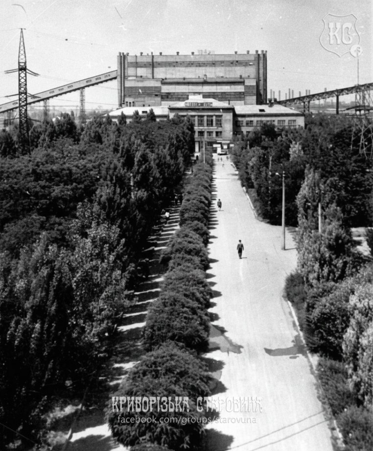 Алея веде до адміністративно-побутового комбінату РЗФ-1 Новокриворізького ГЗК, на тлі якого видно промислові будівлі та конвеєри. Дорогою йдуть працівники, а навколо — озеленена територія підприємства.