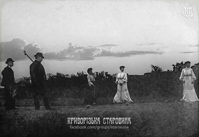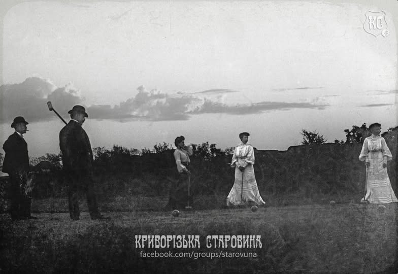 На фото зображено групу людей у вбранні початку XX століття під час гри в крокет на околицях Кривого Рогу. Чоловіки в костюмах і капелюхах-казанках та жінки в довгих світлих сукнях позують з ігровими молотками на тлі степового пейзажу. Фотографія Едуарда Карловича Фукса. Скан із фотоальбому Ігоря Рукавіцина «Криворізький альбом за фотографіями Едуарда Фукса початку XX століття», Київ, 2015 р.