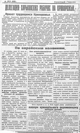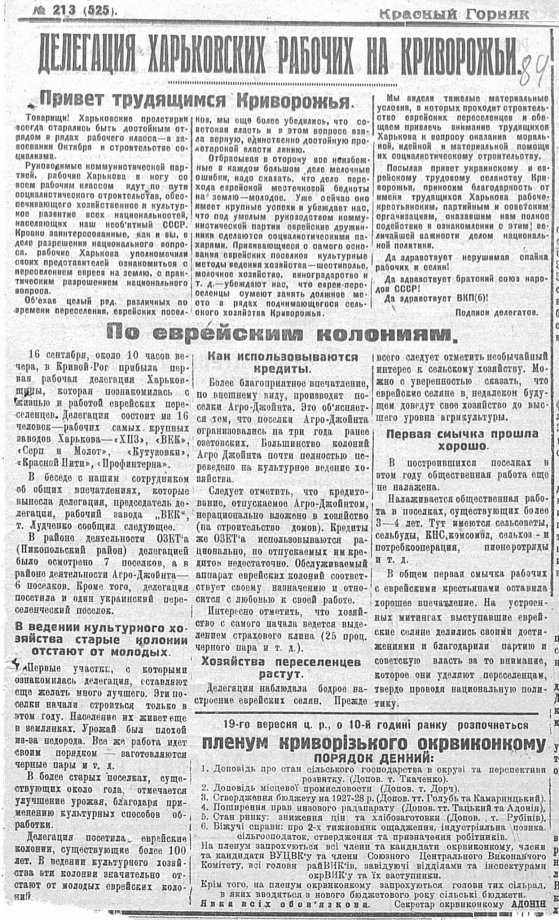 З 16 вересня, близько 10 години вечора, до Кривого Рогу прибула перша робітнича делегація Харківщини, яка ознайомилася з життям і працею єврейських переселенців. Делегація складається з 16 осіб — робітників найбільших заводів Харкова: «ХПЗ», «ВЕК», «Серп і Молот», «Кутузівка», «Червона Нитка», «Профінтерн».