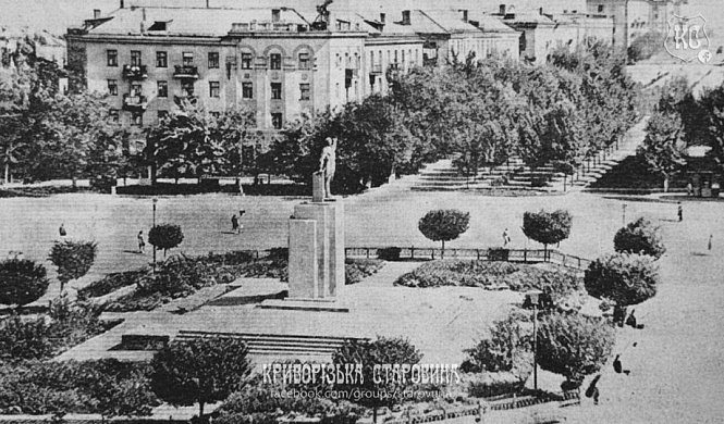 У центрі — пам’ятник на високому постаменті, довкола — впорядкований сквер із підстриженими деревами та житлові будинки сталінської забудови на тлі. З фондів Десята бібліотека