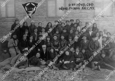 Криворізька округа, 8 квітня 1925 року: груповий портрет делегатів на тлі будівлі з вивіскою, частина присутніх сидить на землі та цеглі, інші розташувалися сходами.