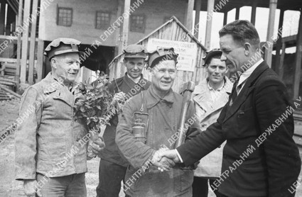 Гірник копальні ім. К. Лібкнехта тресту «Кривбасруда» С. Л. Фількін вітає гірників з врученням урядових нагород: десятника шахти І. С. Вукала, гірничого майстра Л. А. Печенюка, кріпильника С. Н. Нестеренка, гірничого майстра Н. Н. Дурнева. Травень 1949 р. Вільтман.