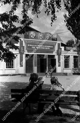 Вхід до клубу, відбудований робітниками станції Долгінцево Сталінської залізниці. 21 серпня 1947 р. Васильченко.