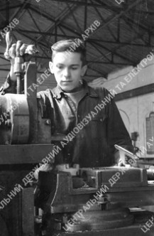 Стругальник механічного цеху Криворізького заводу гірничого обладнання «Комуніст» В. І. Чернявський за роботою. 1949 р. С. Вільтман.