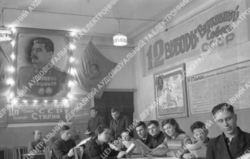 Відвідувачі агітпункту виборчої дільниці № 38 при Клубі гірників копальні ім. К. Лібкнехта в м. Кривому Розі. 1950-02-15. С. Вільтман.
