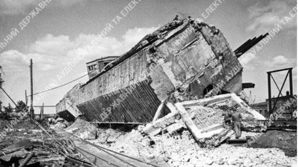 Шахта ім. С. М. Кірова в м. Кривому Розі, зруйнована в боях за місто з німецькими окупантами. 1943 р. Г. І. Угринович.